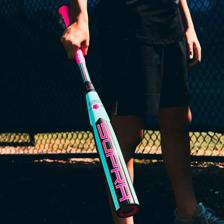 Rev your swing into high gear with the Louisville Slugger Supra™ (-10), a balanced USSSA baseball bat with a high-performing, soft-feeling barrel. Supra’s easy-swinging design features a barrel made with updated composite material, and its massive 2 ¾” profile delivers an expanded sweet spot for more consistent hits. Supra plays loud with its Neon Mint & Pink design, and its APX Composite delivers maximum performance right away – helping travel ball’s youngest players put their stamp on the game.