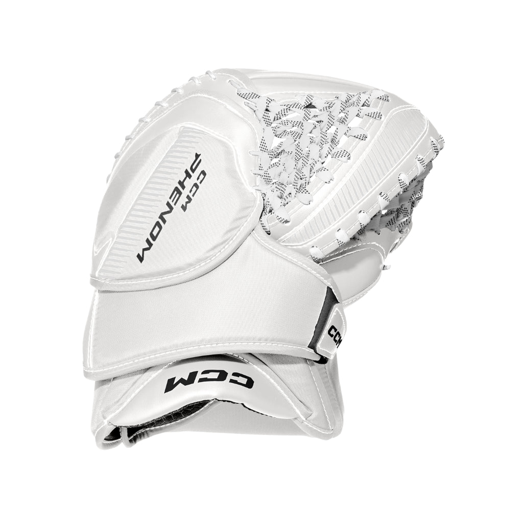 The CCM Phenom Junior Goalie Catch Glove features a lightweight LITECORE™ design for balance and easy puck control. The Crossform Strap ensures a secure, responsive fit with mesh finger stalls. Game-Ready Fit allows easy opening and closing, while the HEXA Palm adds grip. The Single +1 Tee with skate lace provides a deep pocket, and FLEXMOTION enhances mobility and coverage.